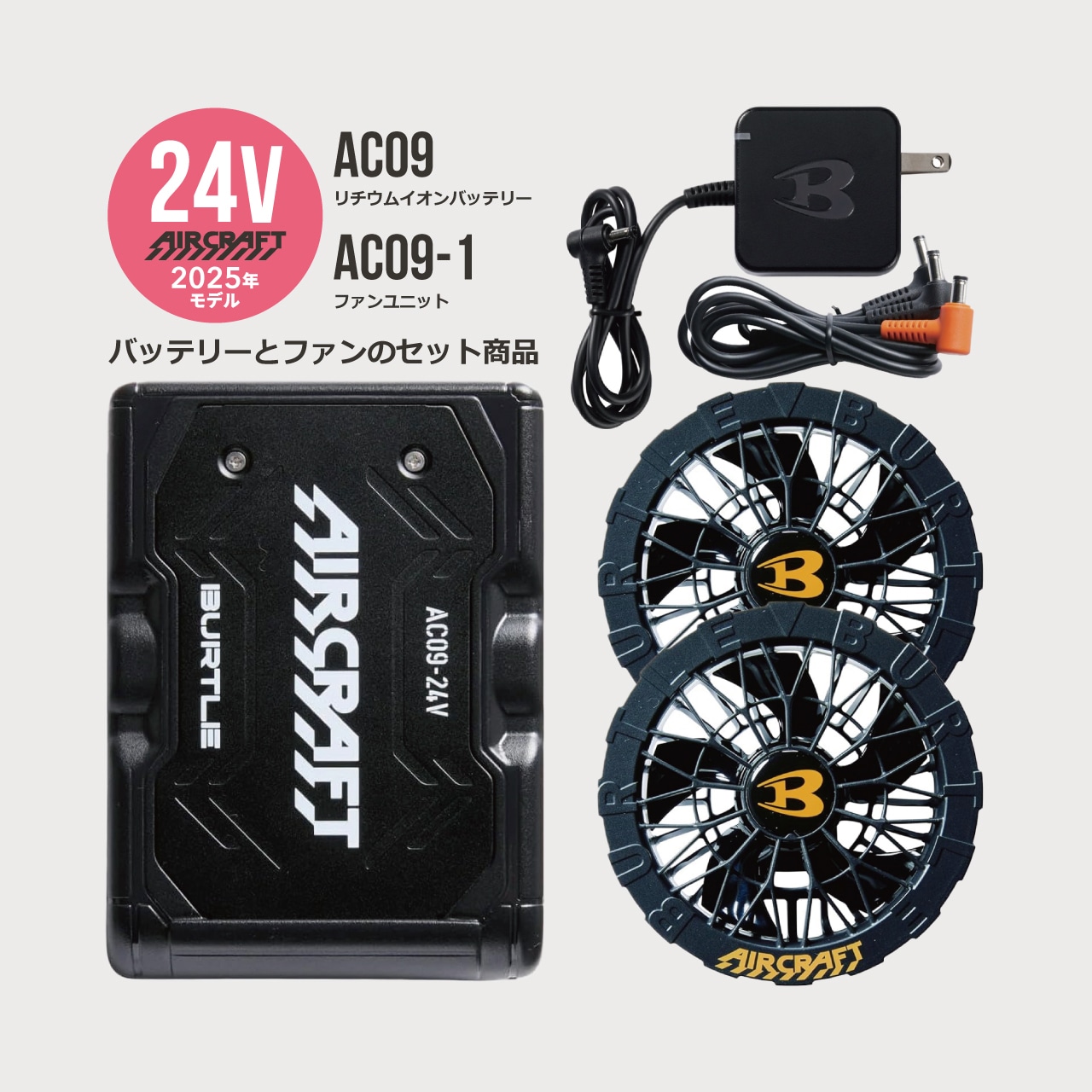 【BURTLE】バートル エアークラフト 2025年 ファン付きウェア 空調 服 作業着 24V リチウムイオンバッテリー ファン セット AC09 + AC09-1 / 1 SET